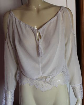 Blusa blanca de estilo bohemio con detalles de crochet en mangas y parte delantera. Parte de atrás lisa. Con goma en el cuello y puños. Se puede encajar al cuello o a los hombros como escote barco. - Tejido suave. - Ideal para vaqueros.