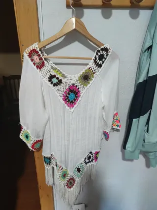 Bonita blusa blanca con un diseño único de flores bordadas a crochet. - Detalle de flores de colores en el escote. - Mangas cortas con adornos de crochet. - Bajo con flecos y motivos florales. - Diseño estilo boho.
