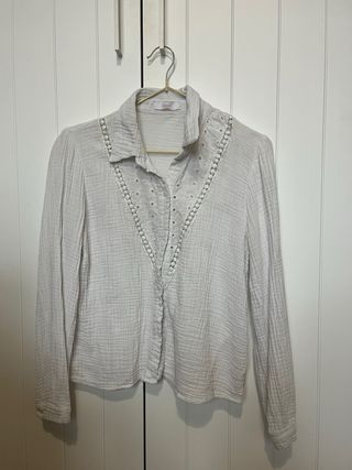 Blusa blanca de Zara con detalles. - Tejido ligero y texturizado. - Cuello camisero. - Cierre de botones. - Adornos de encaje y ojales en el escote.