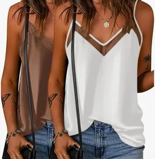 Conjunto de dos blusas con diseño moderno y elegante. - Escote en V con detalle de malla. - Tirantes finos ajustables. - Tejido ligero y fluido.