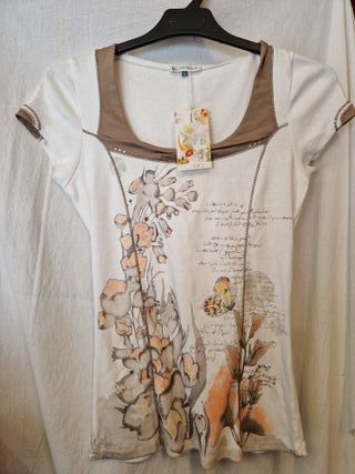 Blusa de manga corta con un bonito estampado floral y mariposas. Presenta detalles de costuras y un escote cuadrado. b5-35 - Diseño con flores y escritura. - Ribete en contraste en cuello y mangas.