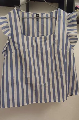 Blusa de SHEIN con un diseño de rayas verticales en azul y blanco. Presenta un escote cuadrado y mangas cortas con volantes. - Diseño de rayas verticales. - Escote cuadrado. - Mangas con volantes.