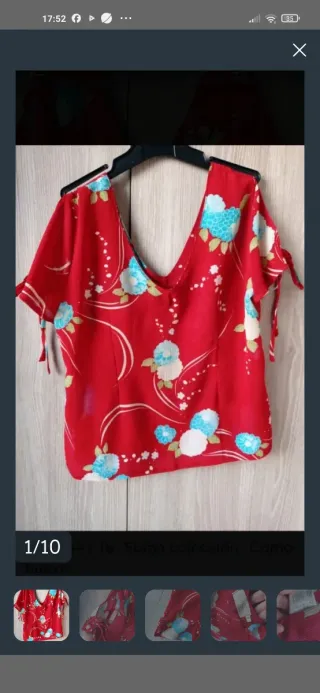 Blusa de manga corta de la marca espiga talla XXL equivalente a 44 solo se ha puesto una vez Es de color rojo con estampado floral en tonos turquesa y blanco cien por cien poliéster MIDI de tórax 108 cm de cintura 100 de cadera 108 y de largo 60 la manga es corta con detalle de lazosEl diseño es entallado - Diseño con escote en V. - Mangas con detalle de lazo. - Estampado de flores azules y blancas sobre fondo rojo. No leer moda zapatos hogar playa veraneo vacaciones fiesta primavera chaquetas armario mío percha