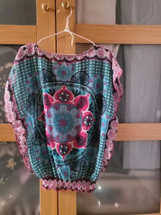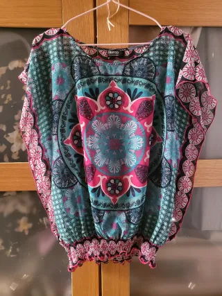 Blusa con un diseño estampado vibrante y llamativo. Presenta un escote con cordones y detalles de encaje. Medidas : . Pecho 60 cm . Cadera 65 cm . Largo 80 cm ( centro ) - Mangas largas con volantes. - Estampado patchwork de cachemir y floral. - Corte asimétrico en el bajo.