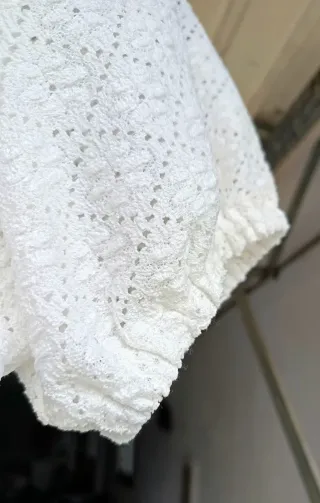Blusa corta con un diseño de calados muy bonito. Es ligera y fresca, ideal para el día a día. Top calado o blusa blanca, corta, que se ajusta debajo del pecho con un cordón. Mangas de farol. Nueva. Sienta muy bien.talla S. - Manga corta abullonada. - Escote cuadrado.