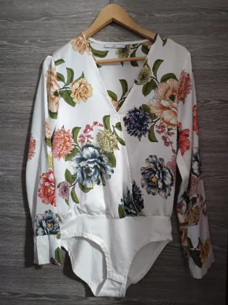 Blusa body con un bonito estampado floral sobre fondo blanco. El diseño cruzado en el escote le da un toque elegante. - Escote cruzado. - Manga larga. - Estampado de flores variadas. Sin usar, en perfectas condiciones 😊