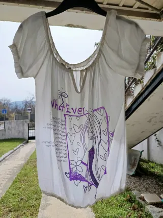 Blusa blanca con un diseño artístico en color morado. El estampado incluye la frase What Ever y un dibujo de una chica con corazones. El escote es redondo y se puede cerrar o abrir con un cordón. La tela es algodón muy fresquito. - Diseño original. - Manga corta. - Cuello elástico. - Bajo fruncido.