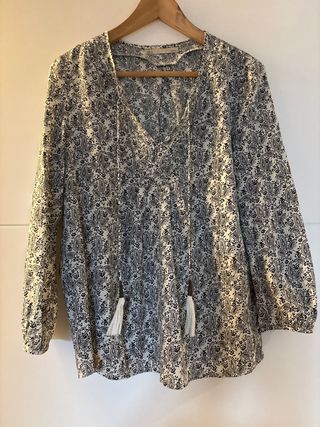 Blusa con un bonito estampado floral en blanco y negro. Tiene un escote en pico con cordones y detalles de borlas. - Manga larga. - Estampado paisley. - Cierre de cordones con borlas.