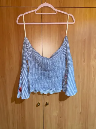 Blusa campesina con un diseño de rayas azules y blancas, con detalles bordados en las mangas. - Mangas acampanadas. - Escote Bardot. - Bordado floral en las mangas.