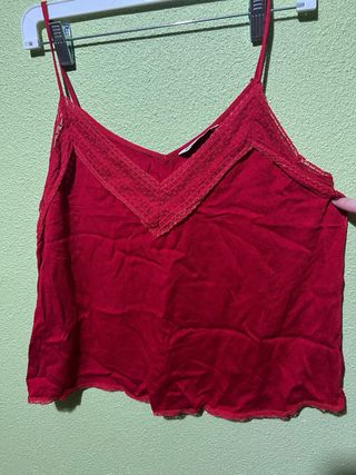 **Blusa corta de manga semilarga acampanada y avolantada. - Tejido ligero y vaporoso. - Escote redondo. - Diseño con volantes en las mangas y bajo,cortita.De 0ysho en la talla S/36. 100% viscosa. **Blusa sin mangas de color rojo, con un diseño moderno y cremallera frontal. - Cremallera metálica color dorada que se puede abrir. - Bajo asimétrico,mas larga por detras que por delante.De Atmosphere, en la talla 36. Aberturas laterales. - Tejido con textura rugosa y vaporosa. UNA POR 2€ ENVIOS SOLO POR WALLAPOP OPCION CORREOS MANDAR MENSAJE ANTES DE COMPRAR POR FAVOR O RECOGER EN MARCHAMALO GUADALAJARA