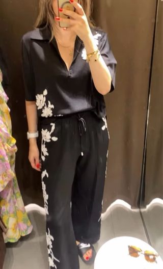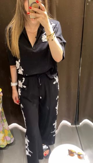 Conjunto de blusa y pantalón de Zara con un diseño elegante. Las dos piezas en talla S. Pantalón 49,95 € Blusa 39,95 € - Blusa con solapa con escote en V y manga corta. - Pantalón con cintura ajustable. - Bordados florales blancos. - Detalles de abalorios.