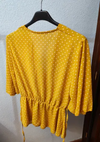 Blusa color mostaza con un lunares blancos de escote cruzado y fruncido en la cintura. Talla única, un uso. - Mangas cortas. - Cinturón para ajustar.