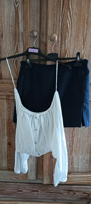Conjunto de dos prendas: un top blanco y una falda-pantalon azul marino - Top con escote pronunciado y botones. - Falda pantalon con detalle de abertura lateral. -Solo se ha usado una vez cada cosa