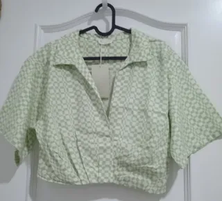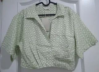 Blusa casual con un diseño de cuadros en tonos verdes y blanco. Presenta un escote tipo camisa y un corte moderno. - Diseño de cuadros. - Escote camisa. - Corte moderno. - Terminación con pliegues.