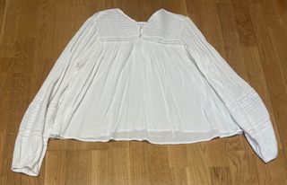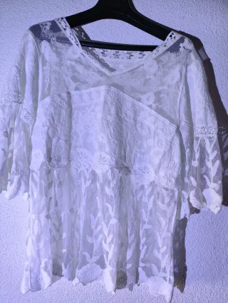 Blusa blanca de manga larga con detalles de encaje. - Tejido ligero y vaporoso. - Escote en V con detalles de puntilla. - Mangas largas con puños abullonados y encaje. - Bajo asimétrico. La he usado una vez. Muy bonita y combinable. La vendo porque no la uso