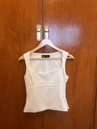 Elegante blusa de Zara con escote barco. - Diseño sin mangas. - Corte entallado en la cintura. - Bajo con vuelo.