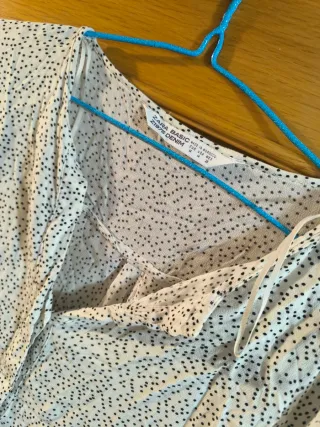 Blusa de Zara con un estampado de pequeños lunares negros sobre fondo blanco. Tiene un diseño fluido y ligero. Manga larga con abertura y lazo, botones en la parte delantera pero con escote y no completamente abierta. Talla M. En la foto está arrugada