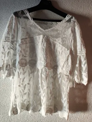Blusa blanca de mujer con un diseño elegante y delicado. Talla S. - Escote en V con detalle de encaje. - Tejido ligero y vaporoso. - Corte holgado.