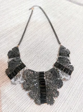 Es la pieza perfecta para transformar un vestido básico en un look de gala o para añadir un toque edgy a una blusa blanca de seda. Ideal para lucirlo en eventos nocturnos, galas y fiestas, Navidades... Llévalo con los hombros descubiertos o un escote redondo simple para que el collar sea el absoluto protagonista de tu outfit. Combina una base que imita el encaje metálico en tono plata envejecida/grafito con piedras rectangulares en color negro brillante tipo azabache.