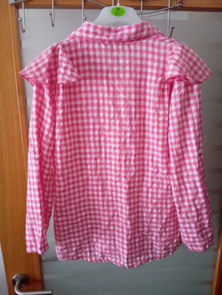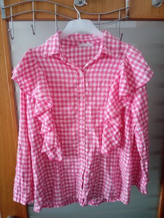 Blusa con un diseño de cuadros en rosa y blanco. Presenta volantes decorativos en la parte delantera. - Cuello camisero. - Cierre de botones. - Manga larga con botón para remangar.