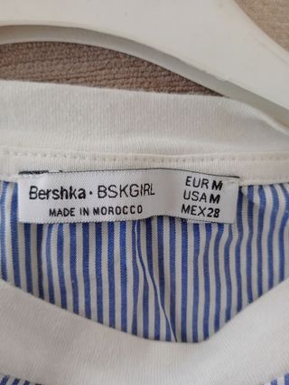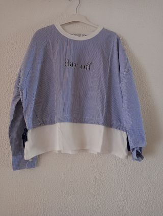 Blusa de rayas con detalle de texto day off . Talla m - Diseño de rayas verticales azules y blancas. - Doble capa con bajo blanco. - Mangas largas con lazada.