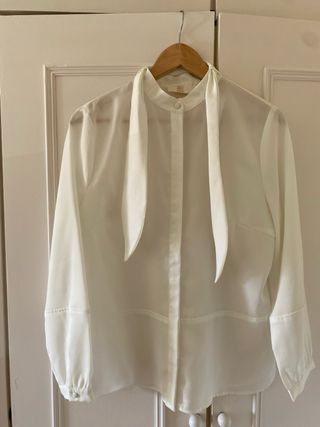 Blusa blanca de MD Woman con lazada al cuello y botonadura frontal “invisible”.