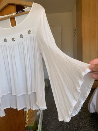 Preciosa blusa blanca de mujer, ideal para cualquier ocasión.Luce impecable. - Talla: xxl - Manga larga - Detalle de lunares en las mangas - Cierre con lazo en la espalda