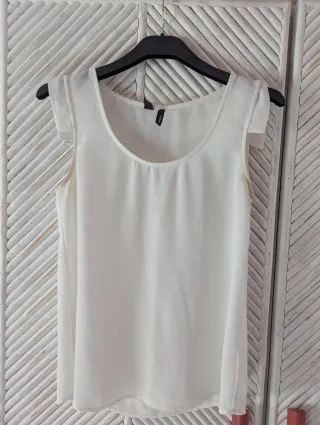 Blusa fluida blanca. Con elástico debajo que hace que quede apretado de esa parte. No hay ni marca ni talla pero me está a mi que uso una M.