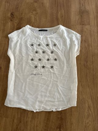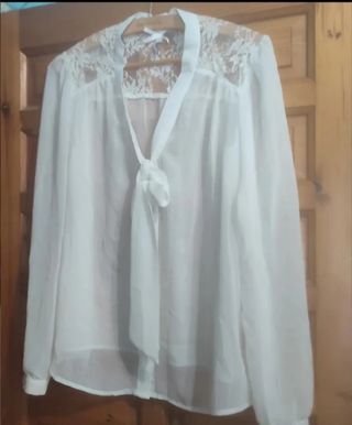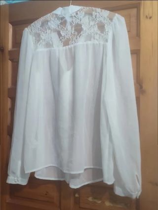Preciosa blusa blanca de la marca Trafaluc. Es de manga tres cuartos y tiene detalles de encaje. Está en perfecto estado.