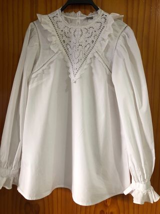 Blusa blanca corta de algodón 100% de Zara. Es una blusa de 48 cm de largo con mangas bombachas. Tiene toda la parte delantera bordada. Por detrás la presilla ya venía rota (muestro fotos). Habría que hacerle una presilla para abotonarla. Por lo demás, es un producto nuevo con su etiqueta de compra y donde se puede ver el precio de la prenda (23.99€). Talla XL. ¡El PRECIO es DEFINITIVO! ¡No se aceptan regateos! ¡Gracias!