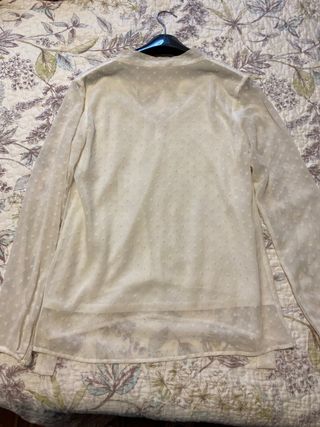 Preciosa blusa de color blanco roto con detalles bordados. Hombro 38, largo 59. Al ser transparente necesita una camiseta de tirante.