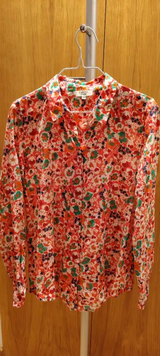 Blusa mujer talla 40 marca CAROL. Algodon 100%. Muy alegre de manga larga con un estampado floral vibrante. El diseño combina tonos rojos, blancos, verdes y azules para un look llamativo. - Cuello camisero. - Puños con boton