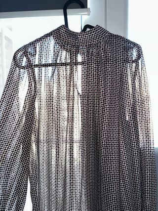Preciosa Blusa de mujer H&M en talla S, confeccionada en tejido ligero y vaporoso con caída fluida. Usada una vez. Presenta un elegante estampado geométrico en tonos burdeos, negro y blanco que aporta un estilo sofisticado y atemporal. El diseño incluye cuello ligeramente subido con frunces que aportan volumen y movimiento, mangas largas abullonadas con puño fruncido y pequeños botones decorativos forrados en el mismo tejido, un detalle cuidado y distintivo. Cierre trasero con pequeña abertura y botón al cuello. Tejido semitransparente, ideal para combinar con top interior o lencero.