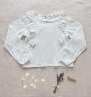 Camisa blanca con un delicado bordado de estrellas. - Cuello con volantes. - Cierre de botones. - Mangas largas abullonadas.