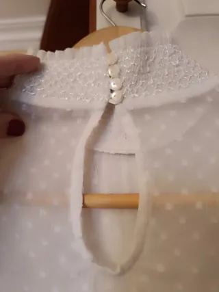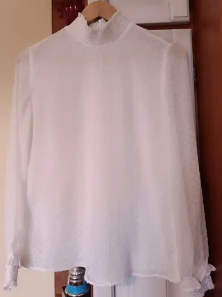 Elegante blusa blanca con un diseño delicado. - Tejido ligero con pequeños topos. - Cuello alto con detalle de encaje. - Mangas largas abullonadas con puño fruncido. - Adorno de encaje en los hombros. - talla XS, medidas hombro 35 cm, largo 60,5 cm, largo manga 63 cm. - nueva sin usar, sin etiqueta - sólo realizó envíos