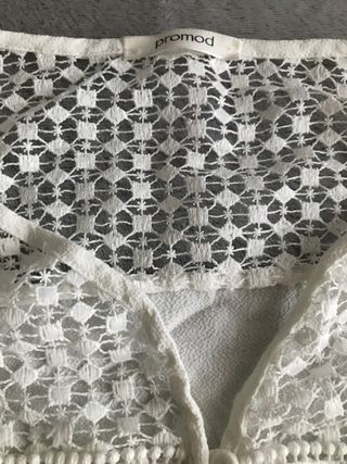 Diseño: Sin mangas. Escote redondo con una pequeña abertura en forma de lágrima y cordones con borlas. Panel frontal de encaje blanco con un patrón floral o geométrico. Corte recto y suelto. Estado: En buen estado de conservación.