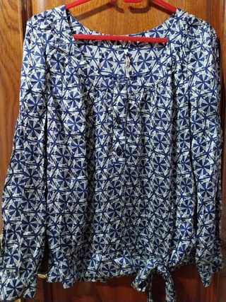 Preciosa blusa de la marca ANTEA. Es de color blanco y azul, con un diseño elegante y original. La talla es la 44. - Tiene un detalle de pedrería en el cuello. - La tela parece ligera y fresca. - Se ata en la cintura.