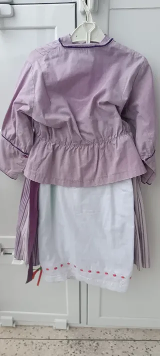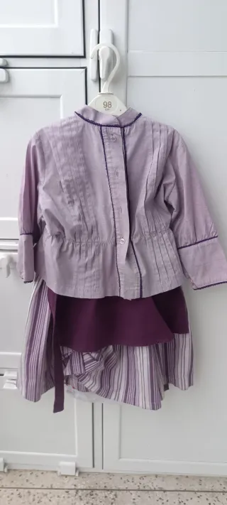Conjunto de dos piezas con un estilo clásico. - Blusa con cuello alto y detalles plisados. - Falda a rayas con delantal. - Cierre de botones en la parte delantera de la blusa. - combinación blanca Hasta 3 o 4 años, depende del tamaño de la niña Marca jaialdi