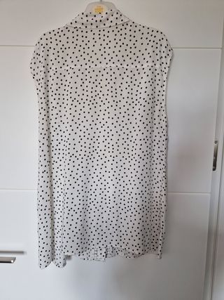 Blusa elástica,negra ,con lunares blancos, con cuello en pico. Queda muy elegante puesta.Talla M