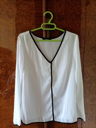 Blusa blanca con lunares en negro. Es de manga larga pero tiene boton para acortar la manga a 3/4. Marca: Zara Talla: XS