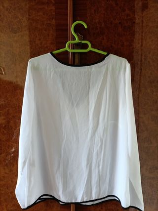 Blusa blanca de corte oversize. - Diseño con cuello camisero. - Dos bolsillos en la parte delantera. - Cierre de botones. - Sin utilizar Esta con todas las etiquetas Aunque pone talla 42 talla muy grande Blanco muy bonito