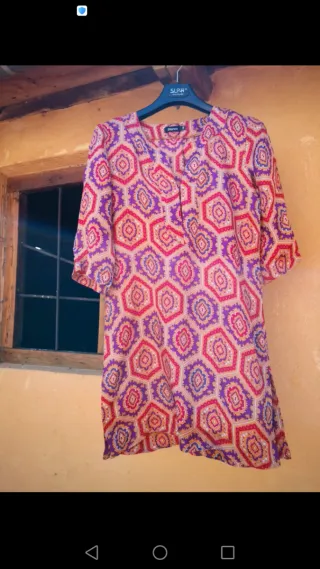 Blusón de estampado arabesco. Es una prenda única y vistosa, ideal para cualquier ocasión. - Diseño de corte amplio y favorecedor. - Manga francesa. - Cuello árabe -Tiene cinturón estrecho de la misma tela por si quiere ponerse - Adjunto fotos con medidas.