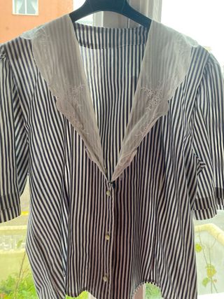 Vendo blusa sin mangas, blanca con estampado de rayas azules y con escote y botones en el pecho. Cuello halter, la tela es de buena calidad y no se arruga. Talla xs, es de Shein, no tiene etiquetas porque vienen sin ellas pero esta sin estrenar y perfecta.