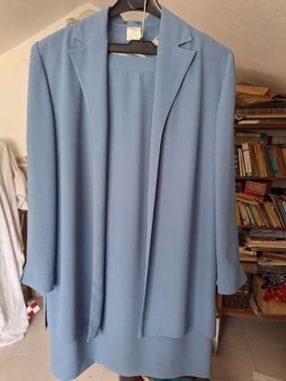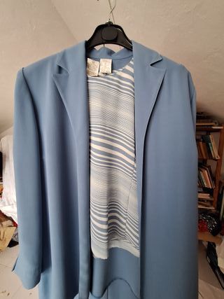 Elegante conjunto de tres piezas para mujer, ideal para la temporada de verano. La prenda exterior es un blazer de corte clásico y la interior una blusa con un estampado moderno. - Blazer azul liso. - Blusa con estampado de rayas blancas y azules. - Falta por debajo rodilla. Aunque es talla 42 equivale a una M