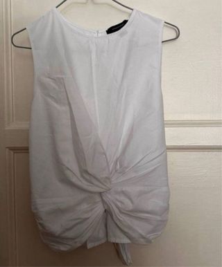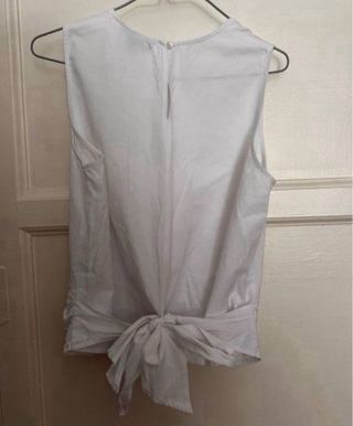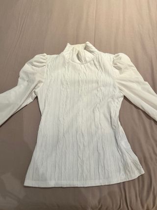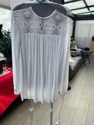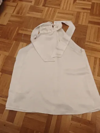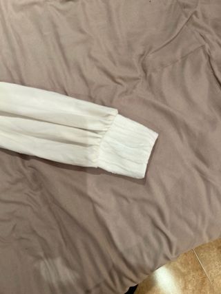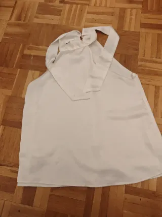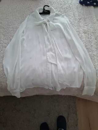 Elegante blusa blanca con un diseño de lazada al cuello. - Manga larga. - Tejido ligero y vaporoso. - El lazo se quita y se pone Me la compré online y me queda grande por eso la vendo