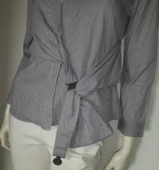 Blusa de Purificación García con un diseño elegante y moderno. - Estampado de rayas finas en gris y blanco. - Corte cruzado con nudo. - Cuello solapa.