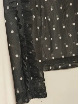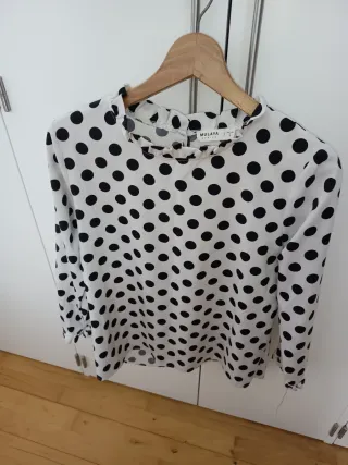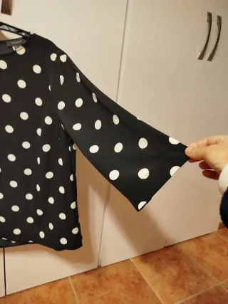 Blusa de manga larga con estampado de lunares en blanco y negro de Zara, con escote en V y detalle fruncido en la cintura. Las mangas también tienen detalle de fruncido. Talla S