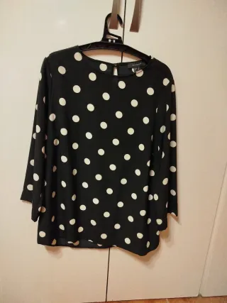 Elegante blusa negra con un divertido estampado de lunares blancos. Es una prenda versátil y cómoda. - Diseño de lunares blancos. - Manga larga. - Cierre en la nuca.