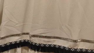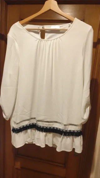 Elegante blusa de manga larga en tono blanco, con detalles que la hacen especial. - Adornos plateados y flecos negros en el bajo. - Cuello redondo con abertura trasera. - Tejido con textura sutil. Muy bien de precio, la compré y no me vale Recoger en el barrio del Pilar