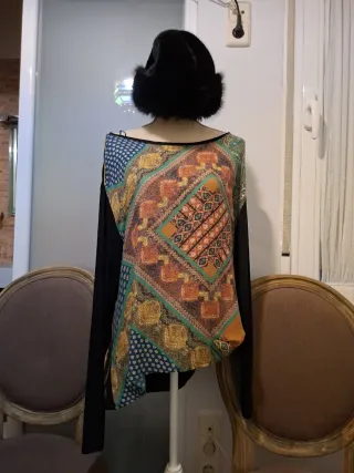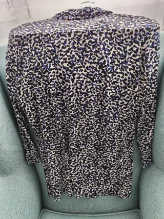 Blusa de seda de la marca Trovels. Talla S (yo diría que vale también para una talla M, no obstante ver medidas en las fotos). En perfecto estado. De color negro y blanco. Es muy original. Elegante blusa de seda con un llamativo estampado. - Diseño único con mezcla de estampados. - Mangas largas en contraste.